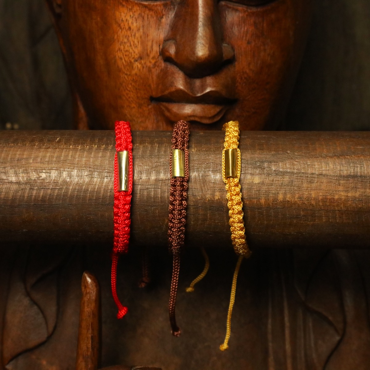 Ce bracelet est confectionné à partir du fil saî sin, un cordon sacré de 9 brins tressés, très solide et imperméable à l’eau. Le saï sin est le lien spirituel qui unit tous les Thaïs : pendant des cérémonies bouddhistes en Thaïlande, lors d’inaugurations et de bénédictions de maisons, de cérémonies de mariage, ou de pré-ordination puisque l’on considère qu’une personne est vulnérable aux dangers et aux obstacles avant d’être ordonnée.