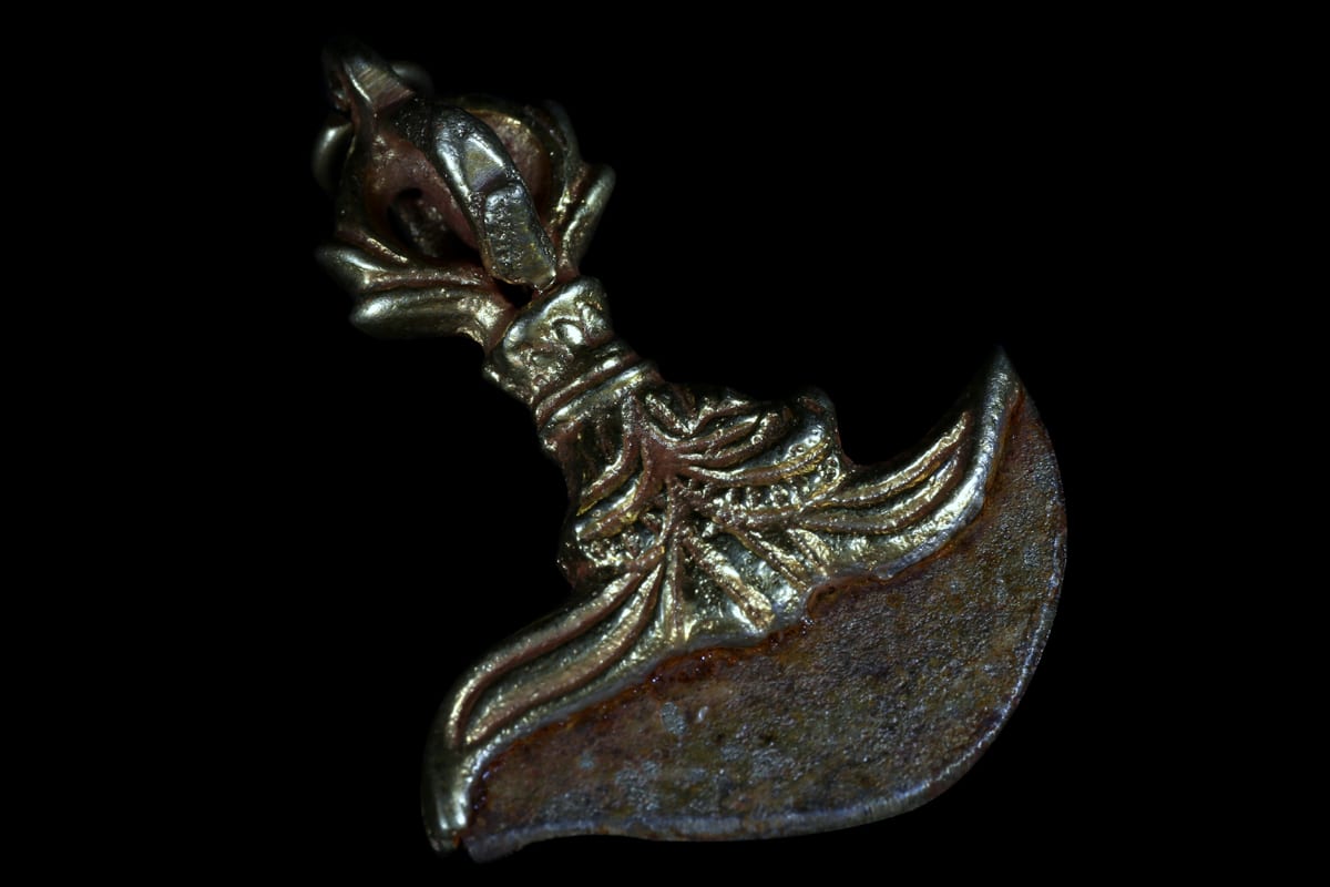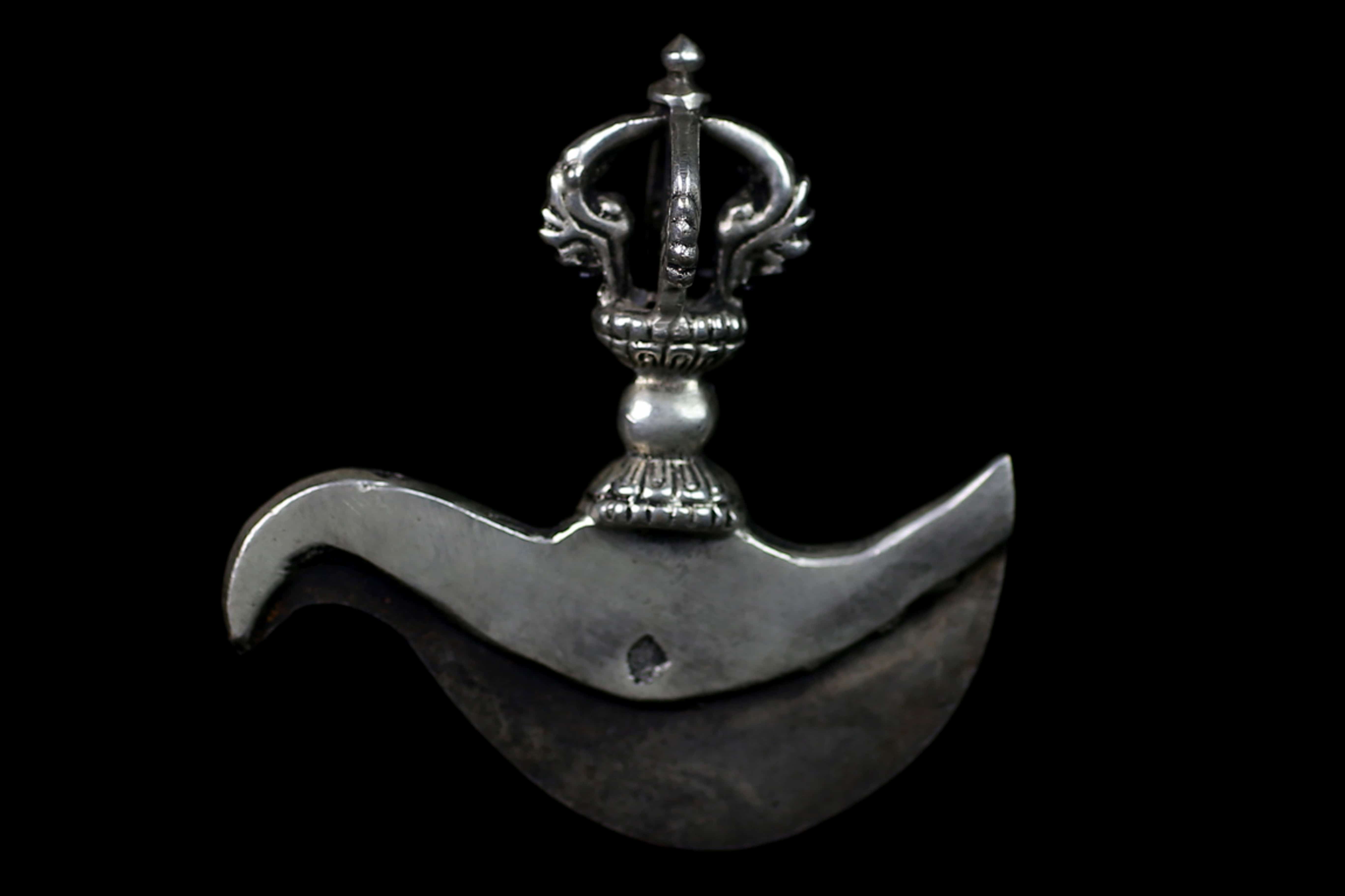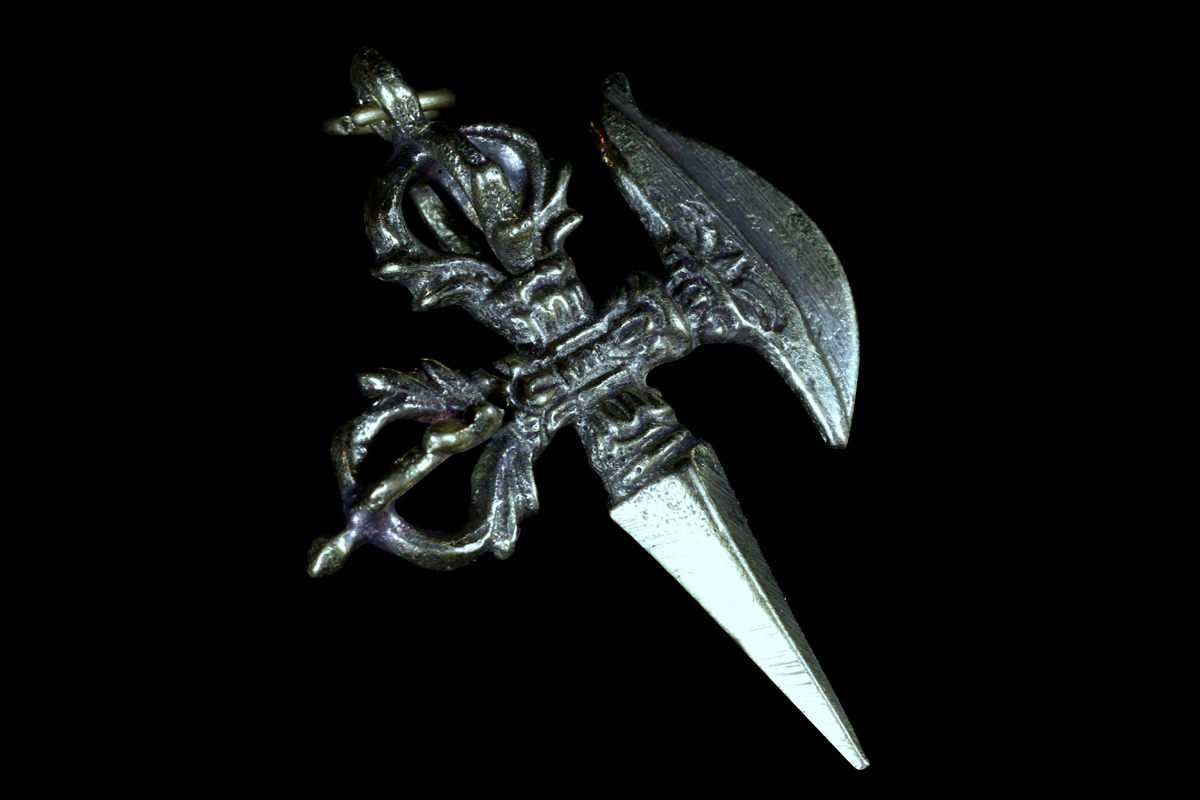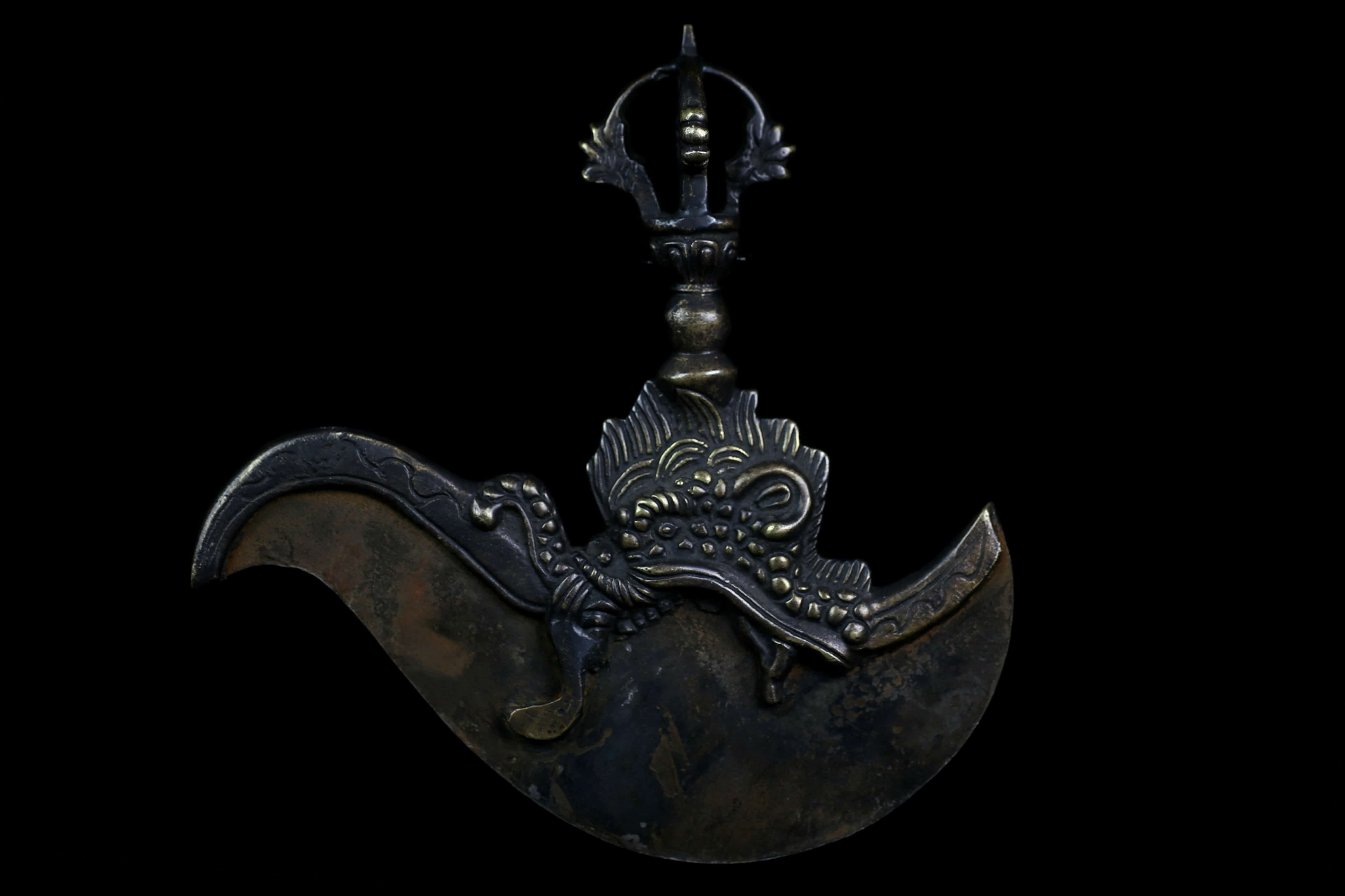 Le khatvanga, le damaru et la coupe crânienne des ascètes sont les emblèmes principaux des yogis et des sages tantriques, le khatvanga, le couperet à lame courbe et la coupe crânienne sont quant à eux les trois principaux attributs des yogini et dakinis tantriques. La lame du couteau des dakinis est plate, semi-circulaire et tranchante, elle se termine par un crochet. Ce couteau peut être utilisé pour couper, râcler, tirer et exécuter tous les gestes liés à l’écorchement. La poignée est coiffée d’un demi-vajra, elle est fixée sur le croissant intérieur de la lame au moyen d’une monture en or.