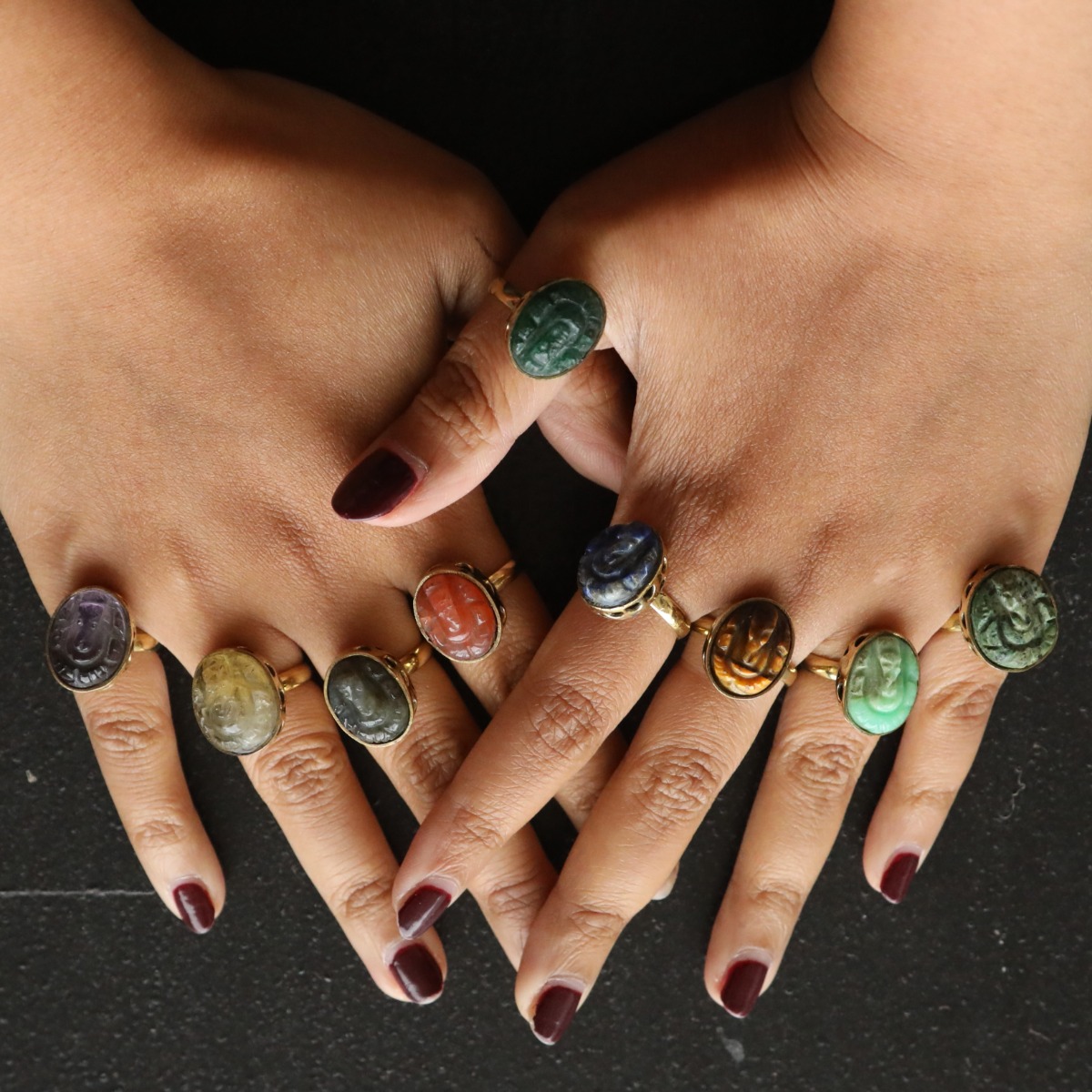 Bague Ganesh Laiton - Oeil de Tigre - Cornaline - Amétiste - Onyx Noir - Labradorite