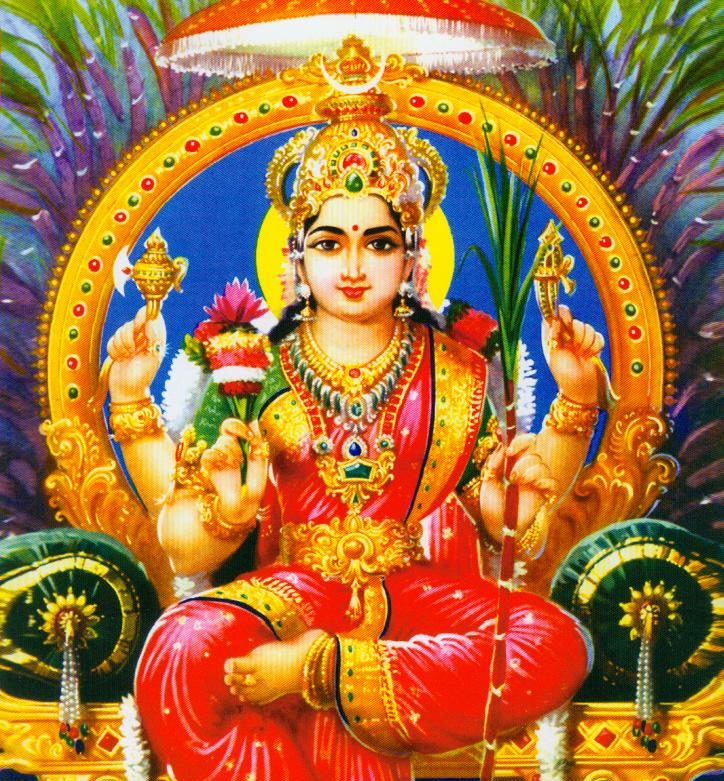 - Gaja Lakshmi : Déesse des richesses animales (bétail et les éléphants). Quatre bras, habillée en rouge, porte deux lotus, les deux autres bras font l’abhaya-mudra et la varada-mudra. Elle est entourée par deux éléphants qui l’aspergent de l’eau de la prospérité.