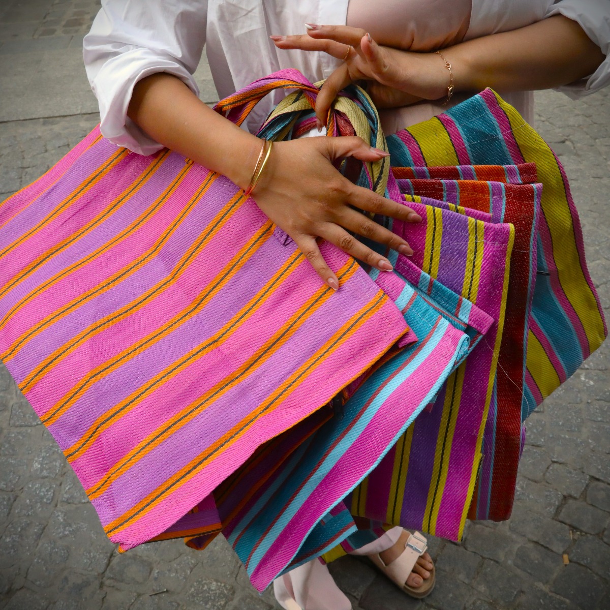 Ces cabas rayés indien en plastique recyclé, dont le motif de rayures très identifiable est appelé "bayadère", sont sans doute un des éléments les plus typiques de l'Inde d'aujourd'hui. Le sac indien rayé c'est aussi le It Bag des courses chic.