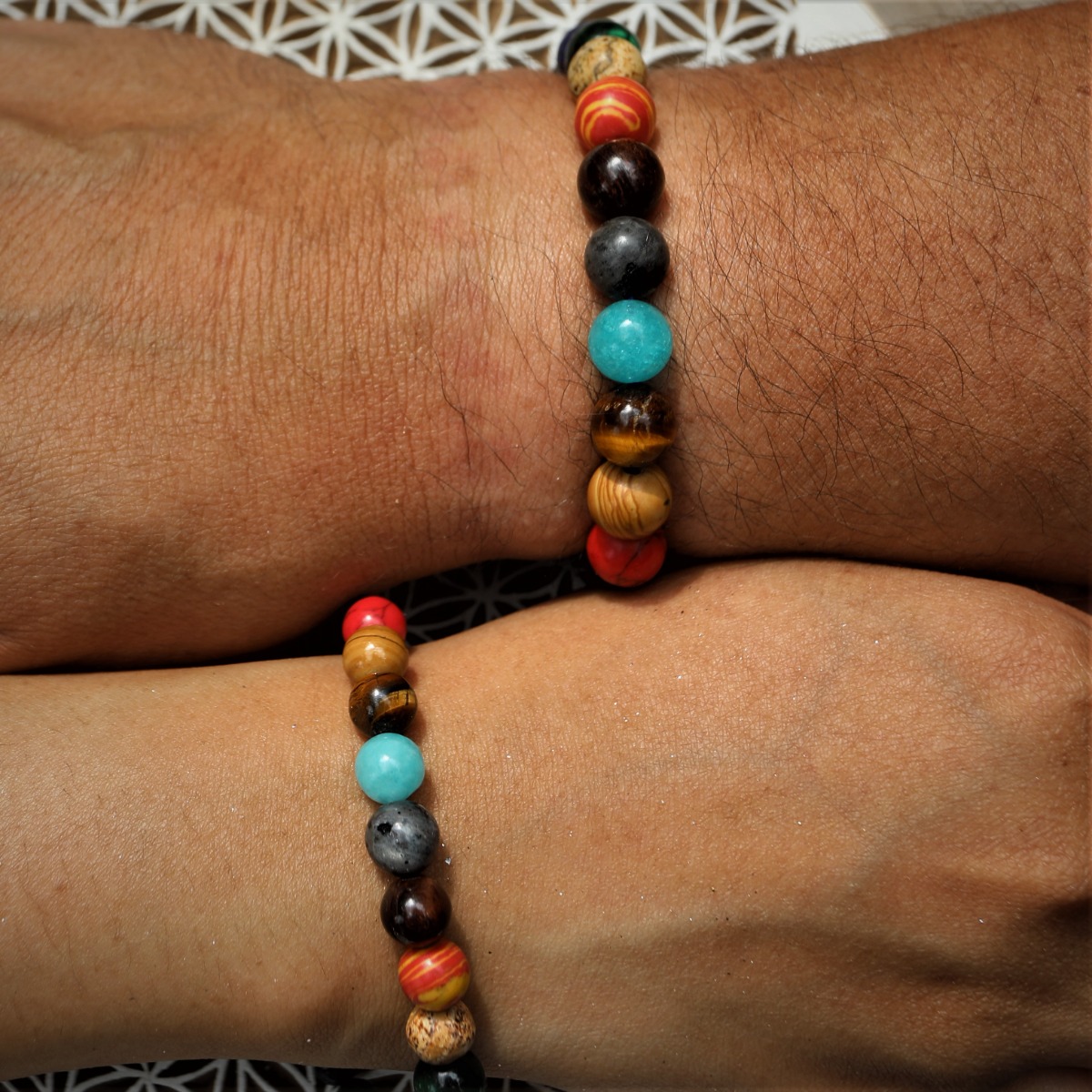 La pierre d’Eilat, bleu-vert, mélange de chrysocolle, de turquoise et de malachite associe les propriétés de ces trois minéraux.